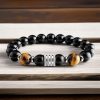 A vörös tigrisszem intenzív, energizáló kőnek számít, amely segíti a bátorságot és a magabiztosságot, míg az ónix stabilitást és határozott, erős kisugárzást ad. A rozsdamentes acél dísz modern, tartós részlet, amely kiemeli a karkötő férfias megjelenését. Ideális választás mindennapi viselethez, különösen azoknak, akik erőt, fókuszt és céltudatosságot szeretnének sugározni.